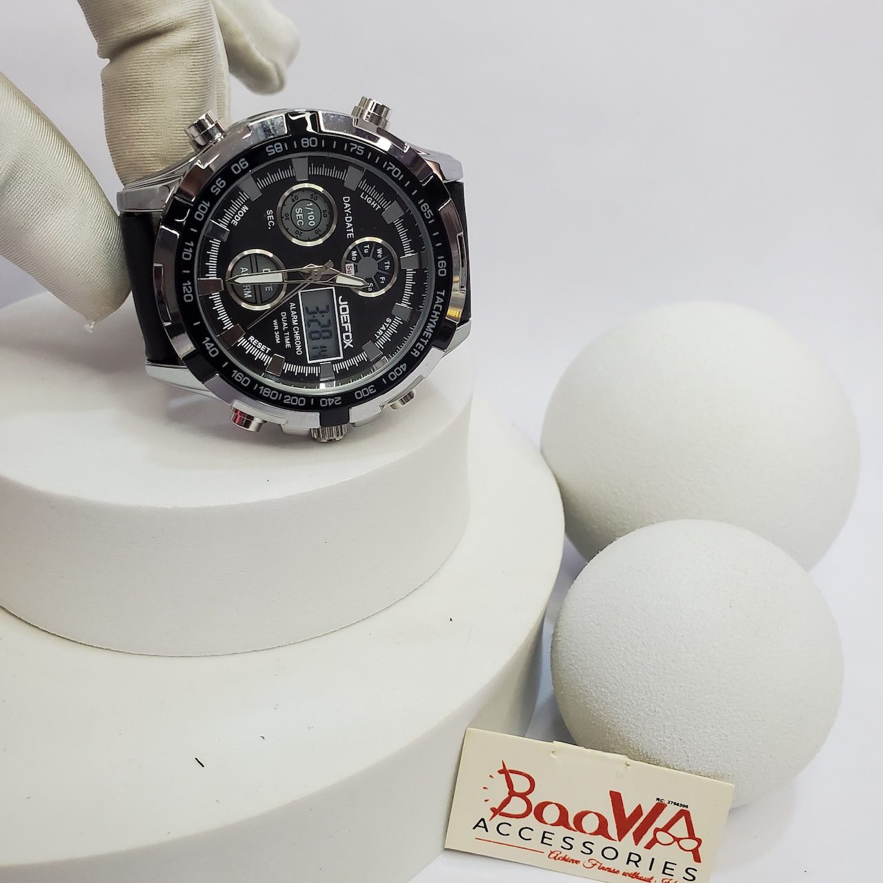 Experience precision and rugged style with the Joefox 1603 Men’s Dual Time Watch. This versatile timepiece combines advanced features like chronograph and 3ATM water resistance with a sleek stainless steel case and comfortable leather strap, perfect for the modern Nigerian man.
