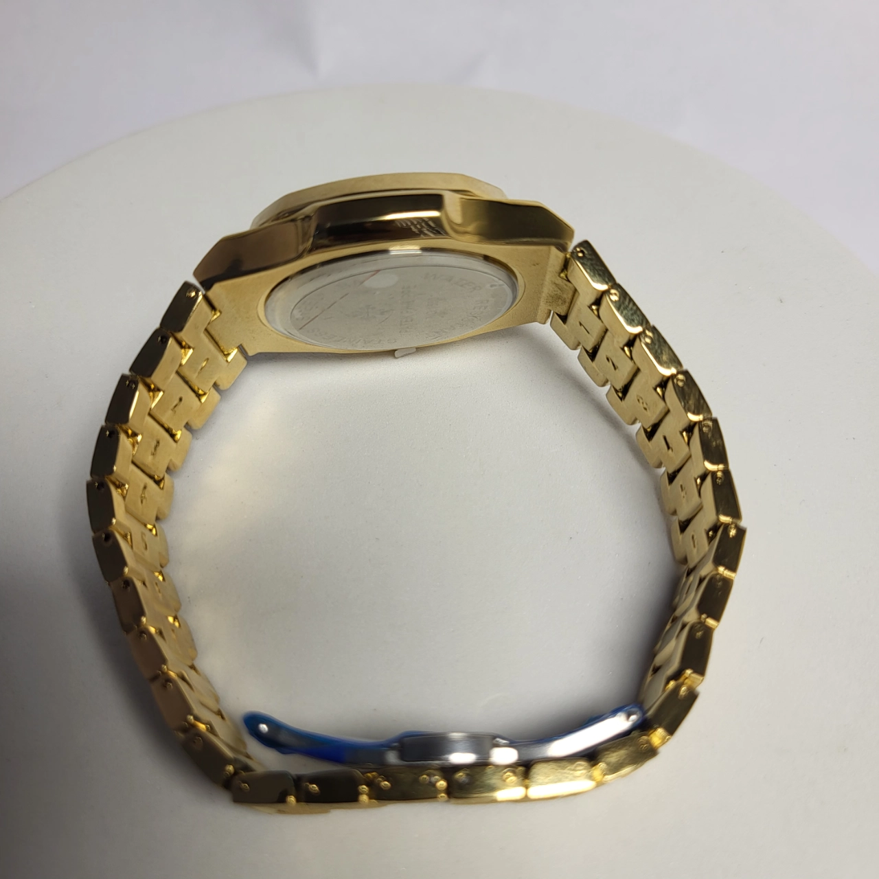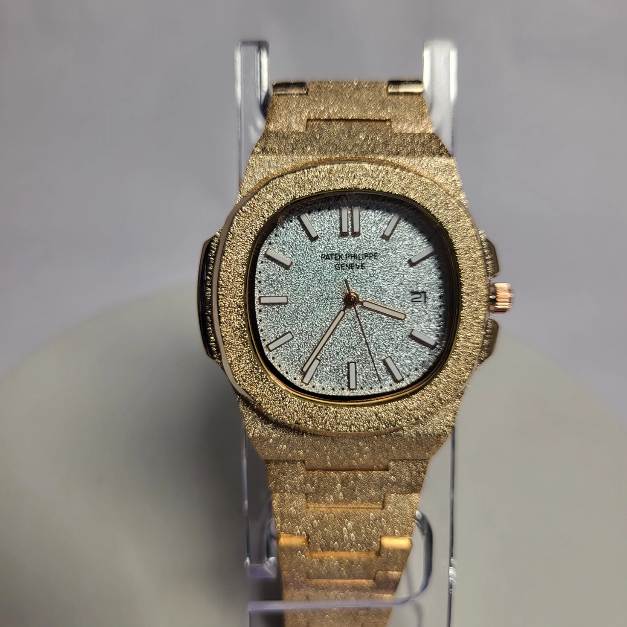 Elevate your style with the Patek Philippe 1560, a masterpiece featuring a distinctive gold textured stainless steel finish and essential date display. This water-resistant timepiece embodies luxury and precision.