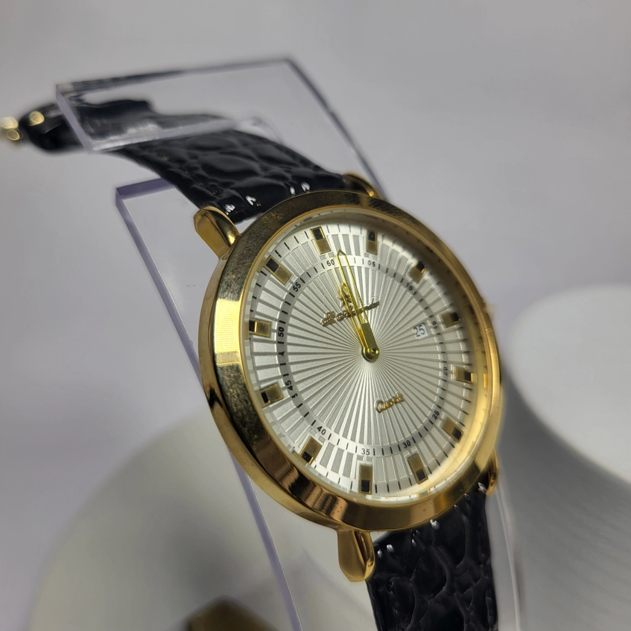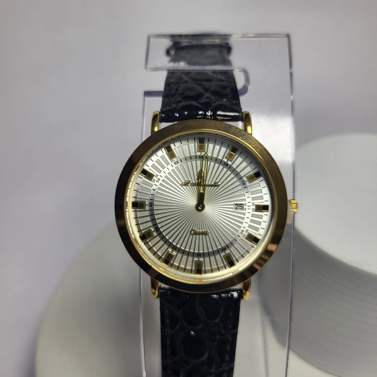 Experience timeless elegance with the St. Alexander Men’s Quartz Watch, featuring a sophisticated gold-tone case, a radiant silver dial, and a practical date display, all complemented by a luxurious black leather strap.
