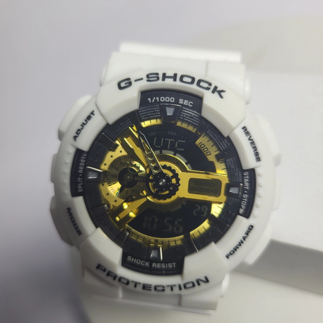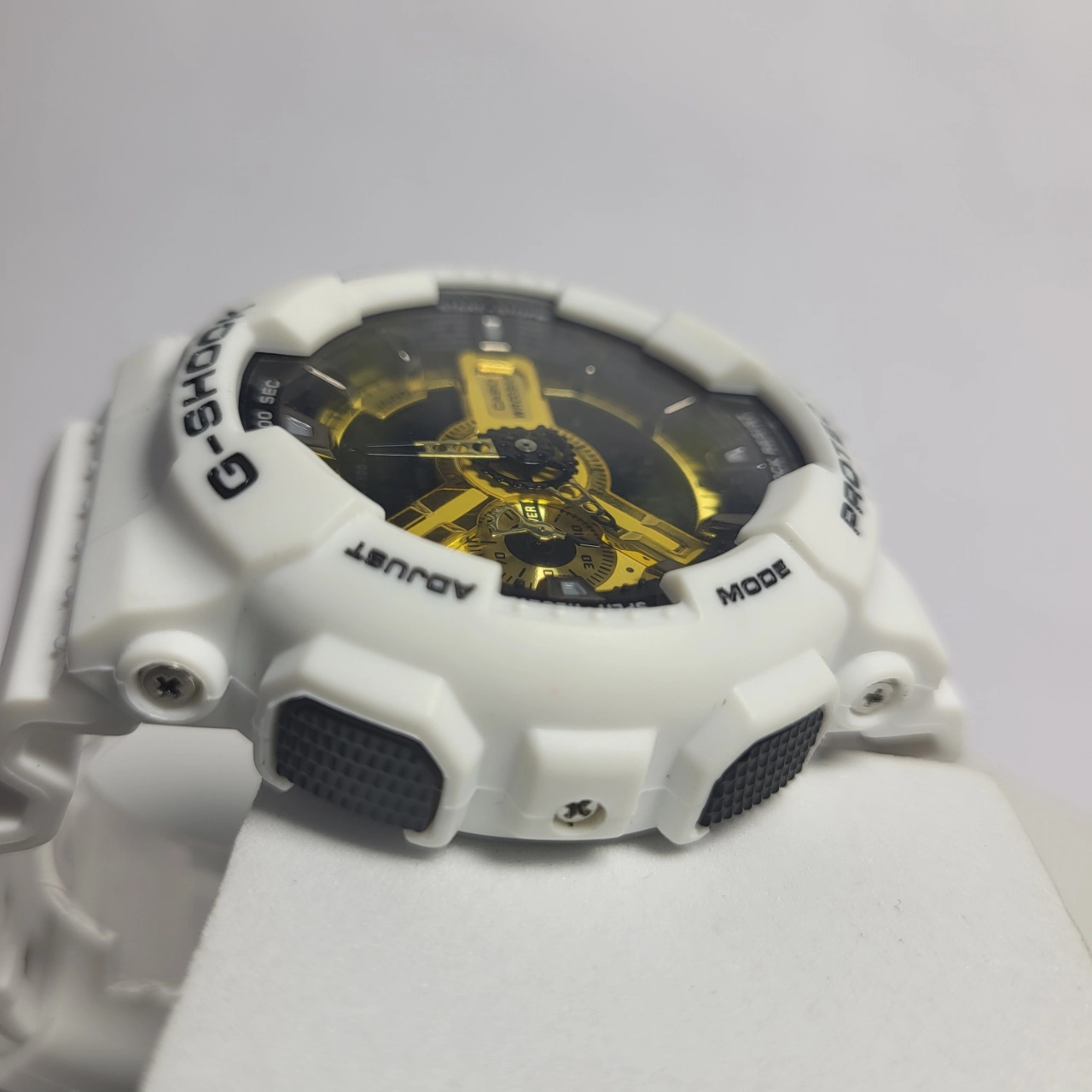 Experience the legendary toughness and distinctive style of the Casio G-Shock GA110. This white and gold timepiece is engineered for extreme durability and reliable performance in any Nigerian environment.